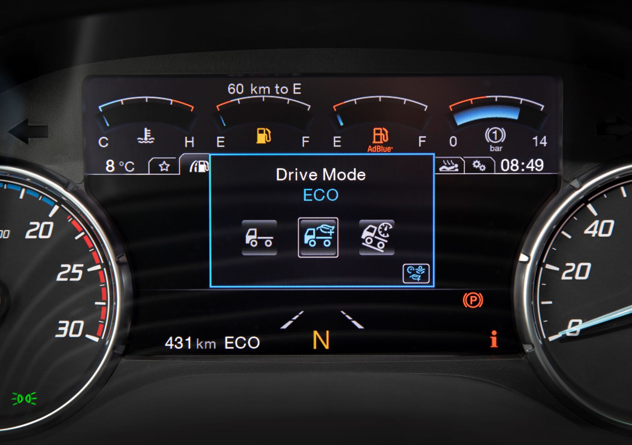 Функция Eco Roll автоматически переводит трансмиссию F-MAX L в нейтральное положение на спусках, повышая топливную экономичность. Отключите Power Mode, чтобы переключать передачи на низких скоростях. Функция ограничения скорости 85 км/ч гарантирует, что вы сэкономите даже при выборе скорости, а функция пятиминутного автоматического отключения позволяет не расходовать топливо при работе двигателя на холостых оборотах.